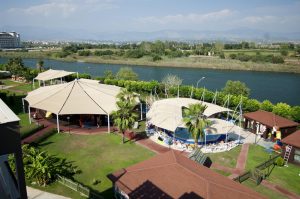 Велика частина дитячого клубу знаходиться на свіжому повітрі, під щільним тентом, який захищає від сонця. Всі ігрові майданчики виконані з екологічно чистого матеріалу, з дотриманням технології безпеки при установці і використанні ігрового обладнання (на землі і на підлозі – м’яке гумове покриття, щоб уникнути серйозних травм, м’яке покриття на твердих предметах і гострих кутах).